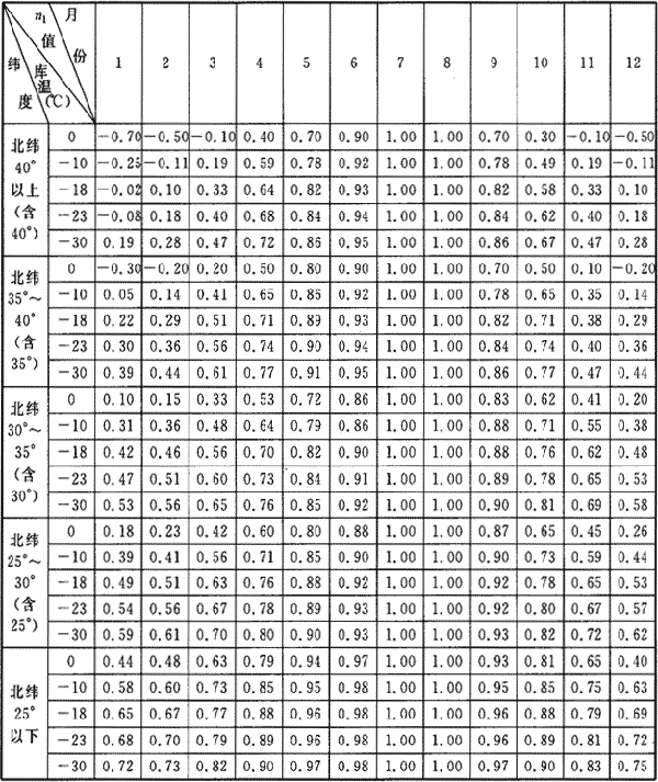 n1——冷间围护结构热流量的季节修正系数,一般可根据冷库生产旺季出现的月份按表6.1.2的规定采用。当冷库全年生产无明显淡旺季区别时应取1;