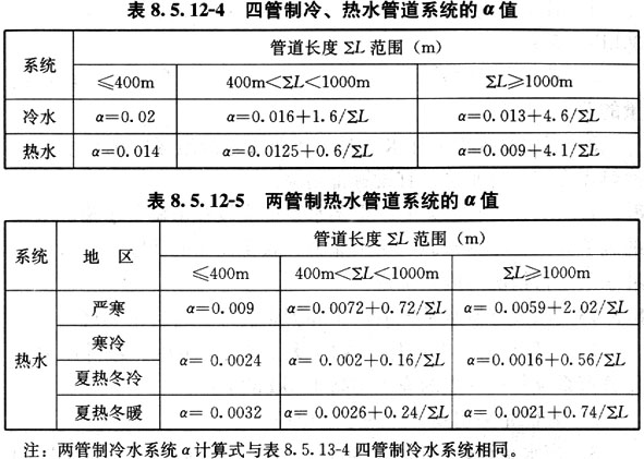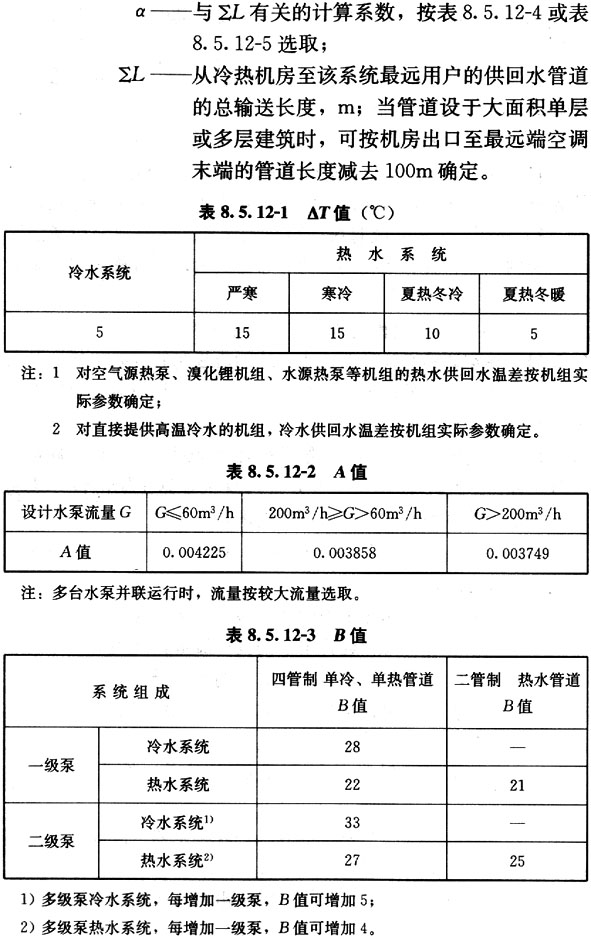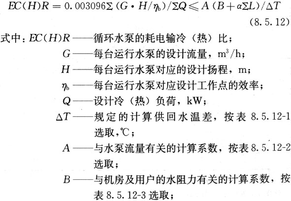 8.5.12 在选配空调冷热水系统的循环水泵时,应计算循环水泵的耗电输冷(热)比EC(H)R,并应标注在施工图的设计说明中。耗电输冷(热)比应符合下式要求: