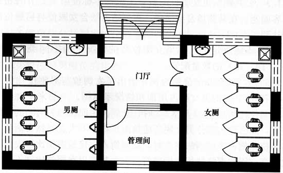 图1为典型现状公厕图:女厕所与男厕所面积一样,女厕位与男厕位比例为:1:1.75,女厕位比男厕位少,男女厕位比例失调严重。