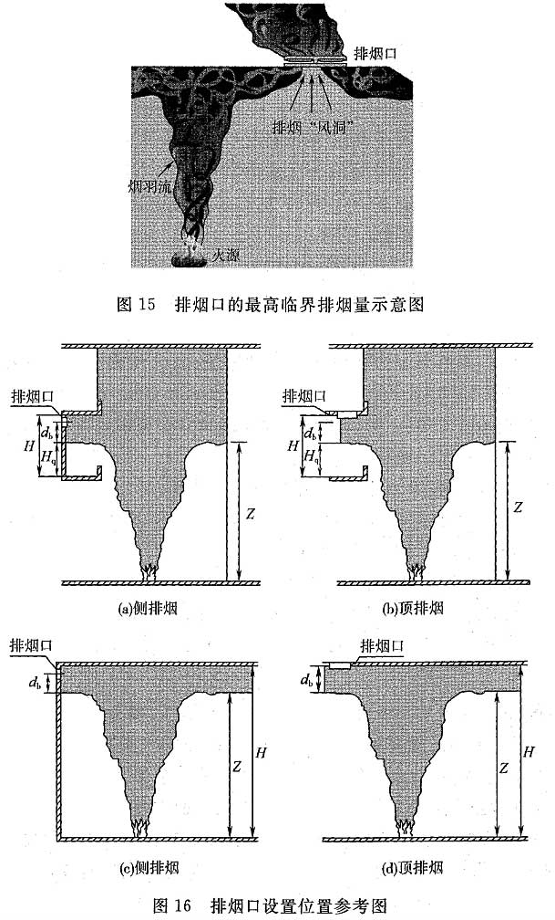 4.6.14 如果从一个排烟口排出太多的烟气,则会在烟层底部撕开一个“洞”,使新鲜的冷空气卷吸进去,随烟气被排出,从而降低了实际排烟量,见图15,因此本条规定了每个排烟口的最高临界排烟量,公式选自NFPA92。其中排烟口的当量直径为4倍排烟口有效截面积与截面周长之比。排烟口设置位置参考图见图16。例如,矩形排烟口的当量直径[宽高为a,b可用式(2)计算:
