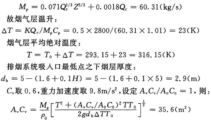 计算举例:以第4.6.11条中的例1为例,现采用自然排烟系统进行设计,自然补风。环境温度为20℃,空气密度为1.2kg/m3。