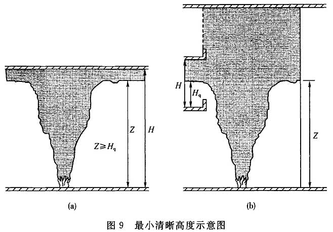 4.6.9 火灾时的最小清晰高度是为了保证室内人员安全疏散和方便消防人员的扑救而提出的最低要求,也是排烟系统设计时必须达到的最低要求。对于单个楼层空间的清晰高度,可以参照图9(a)所示,式(4.6.9)也是针对这种情况提出的。对于多个楼层组成的高大空间,最小清晰高度同样也是针对某一个单层空间提出的,往往也是连通空间中同一防烟分区中最上层计算得到的最小清晰高度,如图9(b)所示。然而,在这种情况下的燃料面到烟层底部的高度Z是从着火的那一层起算,见图9(b)所示。