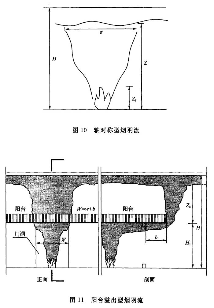4.6.11 轴对称型烟羽流、阳台溢出型烟羽流、窗口型烟羽流为火灾情况下涉及的三种烟羽流形式,计算公式选用了美国消防工程师协会标准NFPA92《Standard for Smoke Control System》(烟气控制系统标准),其形式如图10~图12所示,轴对称型烟缕的火源不受附近墙壁的限制。