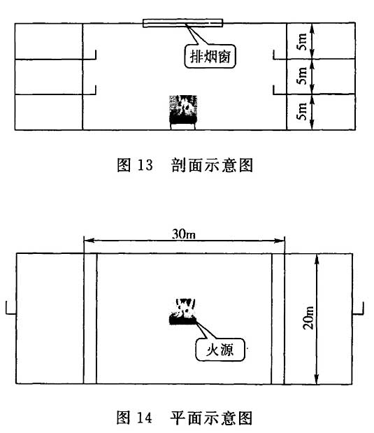 某商业建筑含有一个三层共享空间,空间未设置喷淋系统,其空间尺寸长、宽、高分别为30m、20m、15m,每层层高为5m,排烟口设于空间顶部(其最近的边离墙大于0.5m),最大火灾热释放速率为4MW,火源燃料面距地面高度1m。剖面示意图见图13,平面示意图见图14。