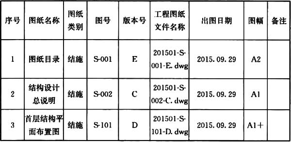对工程图纸进行小的修改通常使用变更云线,并在图纸标题栏的修改记录中进行简短说明。有时候,整张工程图纸或者整版图纸,因为不同程度的修改,需要按照修改的不同版次进行重新发布;或者为分期实施的图纸进行不同分期版次的发布。当这种情况出现,可使用版本代码及版本序列号对图纸进行版本定义并重新发布。每次提交不同版本图纸时,应同时提交本次修改的图纸目录,表1就是一个图纸目录参考范例。