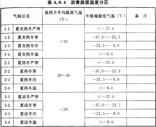 A.0.4 沥青路面温度分区由高温和低温组合而成,应符合表A.0.4的划分。第一个数字代表高温分区,第二个数字代表低温分区,数字越小表示气候因素越严重。