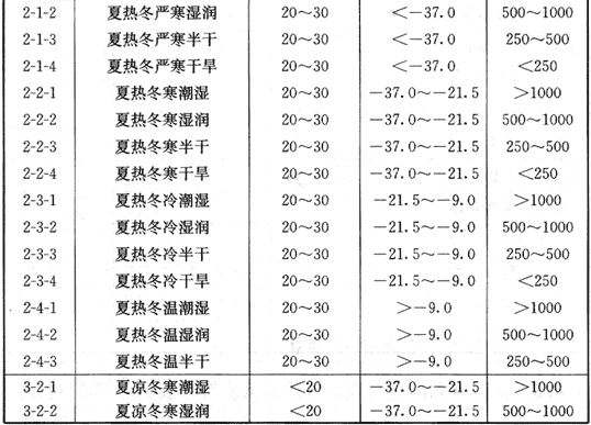 A.0.5 由温度和雨量组成的气候分区应符合表A.0.5的划分。