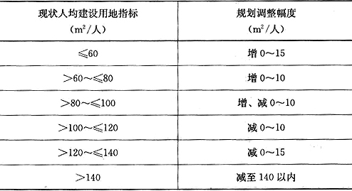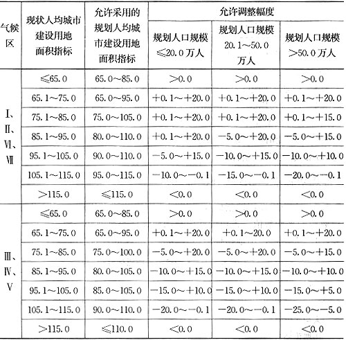 4.2.1 规划人均城市建设用地面积指标应根据现状人均城市建设用地面积指标、城市(镇)所在的气候区以及规划人口规模,按表4.2.1的规定综合确定,并应同时符合表中,允许采用的规划人均城市建设用地面积指标和允许调整幅度双因子的限制要求。