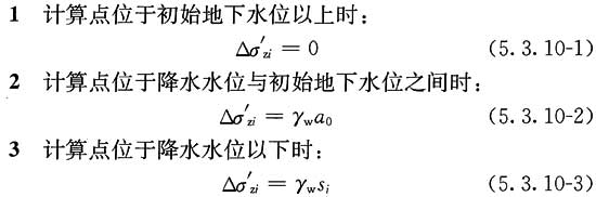 5.3.10 当降水引起的基坑外土中各点有效应力增量符合稳定渗流条件时,宜按稳定渗流计算;当符合非稳定渗流条件时,宜按地下水非稳定渗流计算。有效应力增量尚可根据计算的地下水位降深,按下列公式计算: