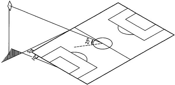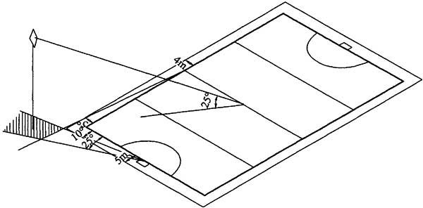 2)采用场地四角布置方式时,灯杆底部到场地边线中点的连线与场地边线之间的夹角不宜小于5°,且灯杆底部到底线中点的连线与底线之间的夹角不宜小于10°,灯具高度宜满足灯拍中心到场地中心的连线与场地平面之间的夹角不小于25°(图6.2.2-2);