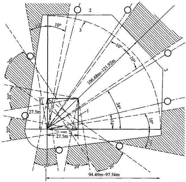 2 灯杆应位于四个垒区主要视角20°以外的范围,灯杆不应布置在图6.2.7中的阴影区;