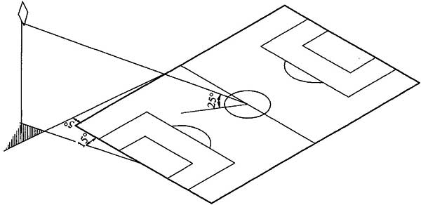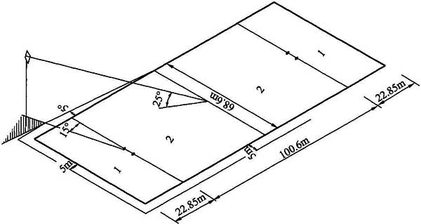 3 采用场地两侧马道布置时,灯具的高度宜满足灯具到场地中心线的垂直连线与场地平面之间的夹角不小于25°;