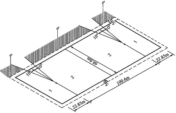 2)采用场地四角布置方式时,灯具的位置应满足图6.2.9-1的要求,灯杆应布置在阴影范围内,灯杆高度宜满足灯拍中心到场地中心的连线与场地平面之间的夹角不小于25°;