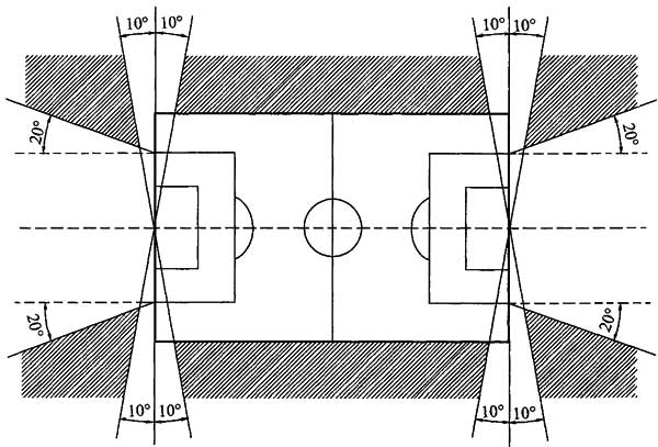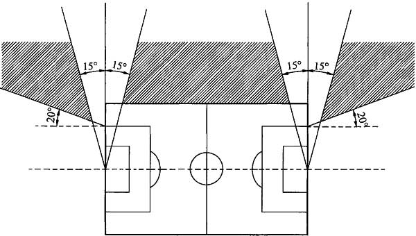 3)采用场地两侧马道布置方式时,灯具不宜布置在球门中心点沿底线两侧10°的范围,以及大禁区两端外侧20°范围内(图6.2.2-3)。