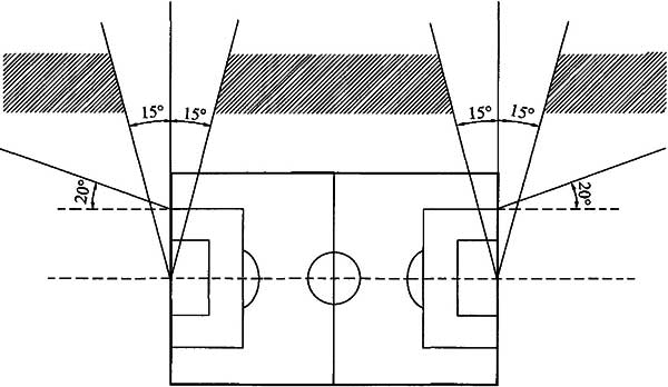 1)采用场地两侧布置方式时,灯具不应布置在球门中心点沿底线两侧15°以及大禁区两端外侧20°范围内(图6.2.2-4、图6.2.2-5);