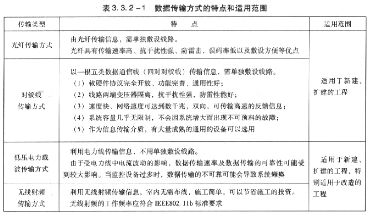 3) 传输方式。照明控制系统数据传输方式在国际上尚无统一的标准,目前主要有光纤传输方式、双绞线传输方式、电力载波传输方式和无线射频传输方式等。这四种传输方式的数据传输速率、传输的可靠程度有较大区别,基本特点和适用范围见表3.3.2-1。