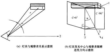 1—灯具发光部分;2—观察者眼睛方向;3—灯具发光中心与观察者眼睛连线;4—观察者;5—灯具发光表面法线