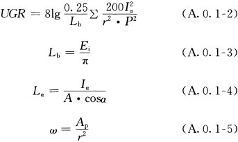 1 当灯具发光部分面积为0.005m2<S<1.5m2时,统一眩光值(UGR)应按下式进行计算: