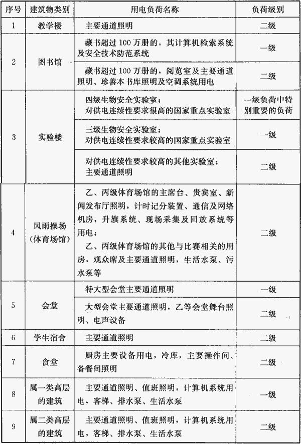 2 教育建筑为高层建筑时,用电负荷级别应为表中的最高等级。