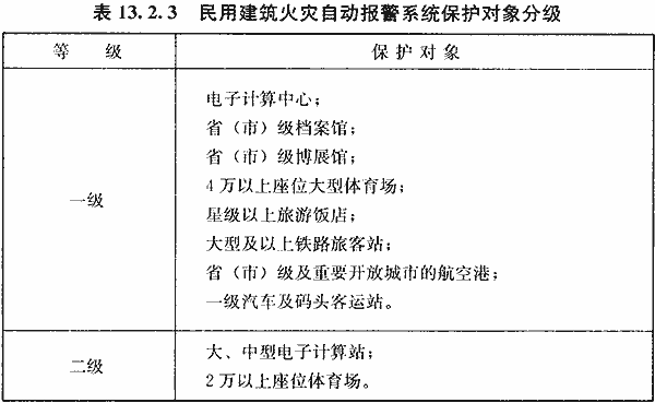 13.2 系统保护对象分级与报警、探测区域的划分 13.2.1 民用建筑火灾自动报警系统保护对象分级,应根据其使用性质、火灾危险性、疏散和扑救难度等综合确定,分为特级、一级、二级。 13.2.2 系统保护对象分级及报警、探测区域的划分应符合现行国家标准《火灾自动报警系统设计规范》GB 50116的规定。 13.2.3 下列民用建筑的火灾自动报警系统保护对象分级可按表13.2.3划分。