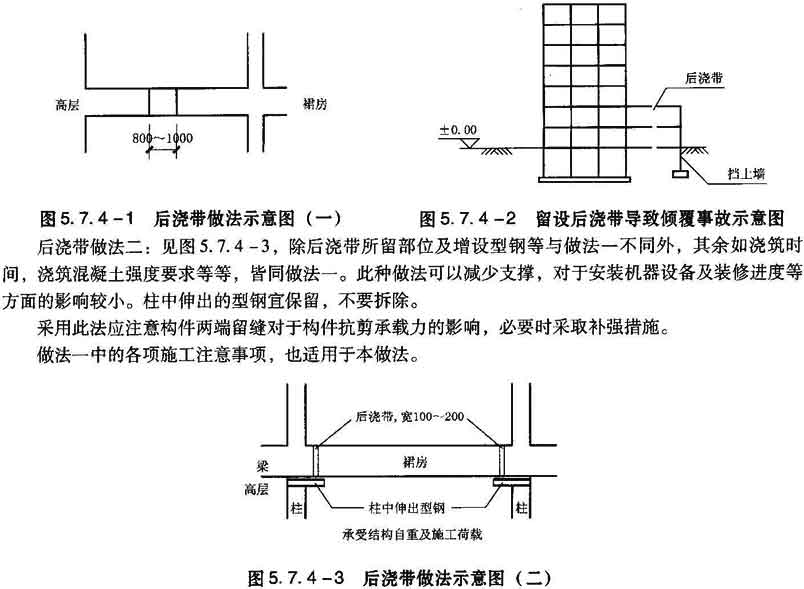 在施工图中须注明:施工单位应将后浇带两侧的构件妥善支撑,并应注意由于留后浇带可能引起各部分结构的承载力问题与稳定问题,图5.7.4—2说明由于设置后浇带使裙房挡土墙的侧压力不能传递至高层主楼,可能导致施工时裙房部分倾覆、发生事故。