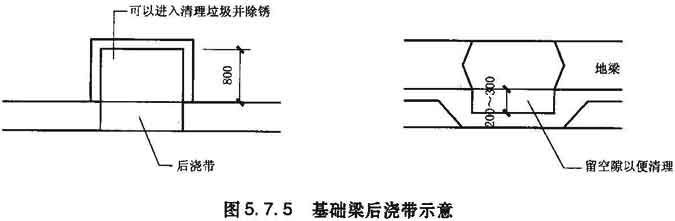 5.7.5 由于高层建筑施工周期较长,因此,后浇带存在的时间也较长。在此期间,施工垃圾掉入带内在所难免,可与施工单位研究清理垃圾的方法,尤其对于基础梁,图5.7.5为基础梁后浇带的一种做法。