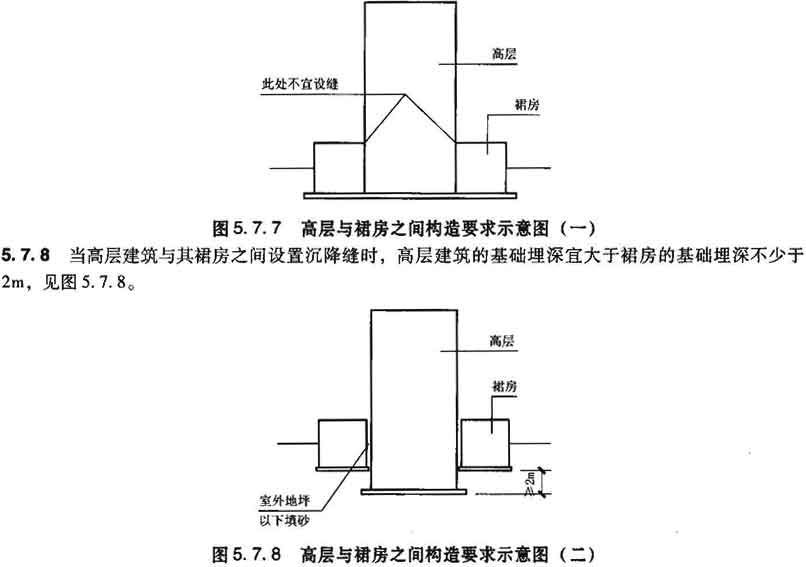 5.7.1 高层建筑的高层部分与多层裙房之间,根据地基及上部结构的条件,可以不设置沉降缝。
