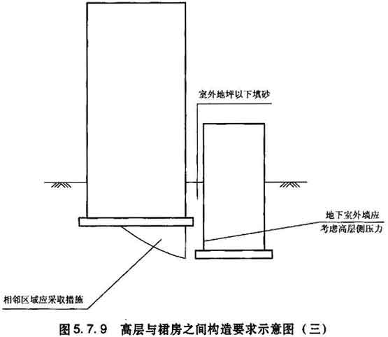 5.7.7 高层建筑与裙房的基础埋置深度相同或差别较小时,为加强高层建筑的侧向约束,不宜在高低层之间设置沉降缝,见图5.7.7。