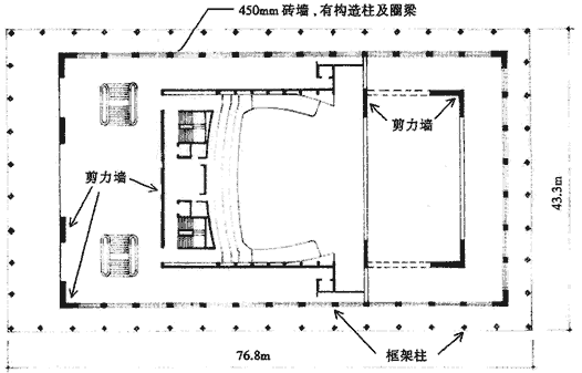 图2.1.7-1~4所示,是中美洲国家尼加拉瓜首都马拿瓜的国家剧院(从立面、剖面可以看出前厅、观众厅及后台三部分如前所述体型、高度、跨度等相差悬殊)。在1972年发生强震时,城市中大部分建筑物倒塌,但该剧院虽受剧烈震动,门厅内大理石柱子上的音乐家头像都掉落在地面上,但整个建筑完好无损,甚至大理石贴面都毫无破坏。该剧院强震完好的关键原因如2.1.7-3平面图中所示。设计师在适当部位加设了剪力墙,因而提高了建筑物的抗侧刚度,使结构具有良好的抗震性能。