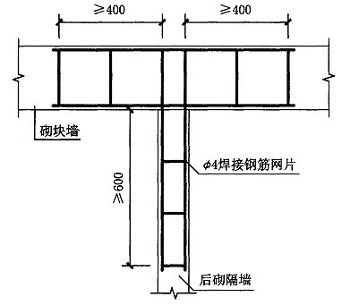 图5.1.4 砌块墙与后砌隔墙交接处钢筋网片