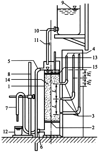 1-封底金属圆筒;2-金属孔板;3-测压孔;4-玻璃测压管;5-溢水孔;6-渗水孔;7-调节管;8-滑动支架;9-供水瓶;10-供水管;11-止水夹;12-容量为500mL的量筒;13-温度计;14-试样;15-砾石层