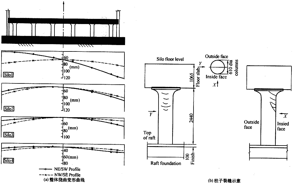 图45 四幢地下仓库平板式筏基的整体挠曲变形曲线及柱子裂缝示意