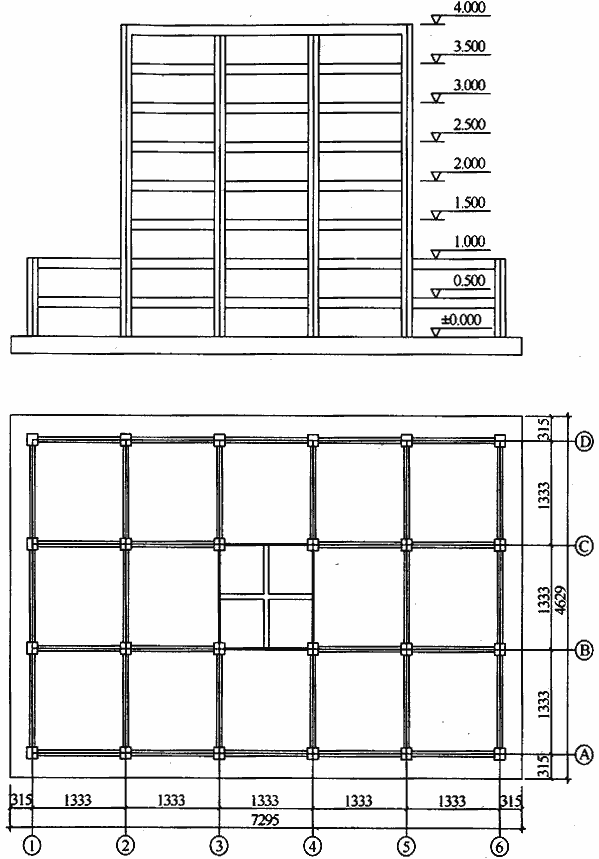 8.4.23 中国建筑科学研究院地基所滕延京和石金龙对大底盘框架-核心筒结构筏板基础进行了室内模型试验,试验基坑内为人工换填的均匀粉土,深2.5m,其下为天然地基老土。通过载荷板试验,地基土承载力特征值为100kPa。试验模型比例i=6,上部结构为8层框架-核心筒结构,其左右两侧各带1跨2层裙房,筏板厚度为220mm,楼板厚度:1层为35mm,2层为50mm,框架柱尺寸为150mm×150mm,大底盘结构模型平面及剖面见图46。