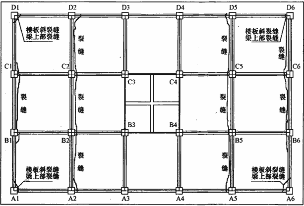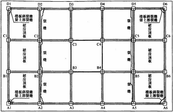 2 裙房的角柱内侧楼板出现弧形裂缝、顺着挠曲方向裙房的外柱内侧楼板以及主裙楼交界处的楼板均发生了裂缝,图47及图48为一层和二层楼板板面裂缝位置图。本条的目的旨在从构造上加强此类楼板的薄弱环节。