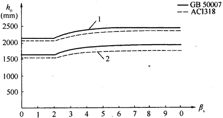 国外试验结果表明,当柱截面的长边与短边的比值βs大于2时,沿冲切临界截面的长边的受剪承载力约为柱短边受剪承载力的一半或更低。本规范的公式(8.4.7-2)是在我国受冲切承载力公式的基础上,参考了美国ACI 318规范中受冲切承载力公式中有关规定,引进了柱截面长、短边比值的影响,适用于包括扁柱和单片剪力墙在内的平板式筏基。图34给出了本规范与美国ACI 318规范在不同βs条件下筏板有效高度的比较,由于我国受冲切承载力取值偏低,按本规范算得的筏板有效高度稍大于美国ACI 318规范相关公式的结果。