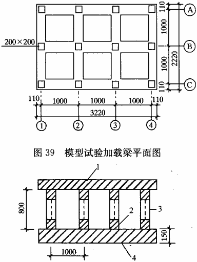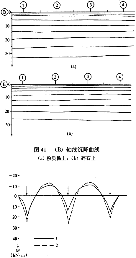 8.4.14 中国建筑科学研究院地基所黄熙龄和郭天强在他们的框架柱-筏基础模型试验报告中指出,在均匀地基上,上部结构刚度较好,柱网和荷载分布较均匀,且基础梁的截面高度大于或等于1/6的梁板式筏基基础,可不考虑筏板的整体弯曲,只按局部弯曲计算,地基反力可按直线分布。试验是在粉质黏土和碎石土两种不同类型的土层上进行的,筏基平面尺寸为3220mm×2200mm,厚度为150mm(图39),其上为三榀单层框架(图40)。试验结果表明,土质无论是粉质黏土还是碎石土,沉降都相当均匀(图41),筏板的整体挠曲度约为万分之三。基础内力的分布规律,按整体分析法(考虑上部结构作用)与倒梁法是一致的,且倒梁板法计算出来的弯矩值还略大于整体分析法(图42)。