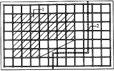 5 室内模型试验结果表明,平面呈L形的高层建筑下的大面积整体筏形基础,筏板在满足厚跨比不小于1/6的条件下,裂缝发生在与高层建筑相邻的裙房第一跨和第二跨交接处的柱旁。试验结果还表明,高层建筑连同紧邻一跨的裙房其变形相当均匀,呈现出接近刚性板的变形特征。因此,当需要设置后浇带时,后浇带宜设在与高层建筑相邻裙房的第二跨内(见图44)。
