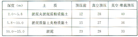 5.1.7 当建筑物的荷载超过真空压力且建筑物对地基的承载力和变形有严格要求时,应采用真空-堆载联合预压法。工程实践证明,真空预压和堆载预压效果可以叠加,条件是两种预压必须同时进行,如某工程47m×54m面积真空和堆载联合预压试验,实测的平均沉降结果如表8所示。某工程预压前后十字板强度的变化如表9所示。