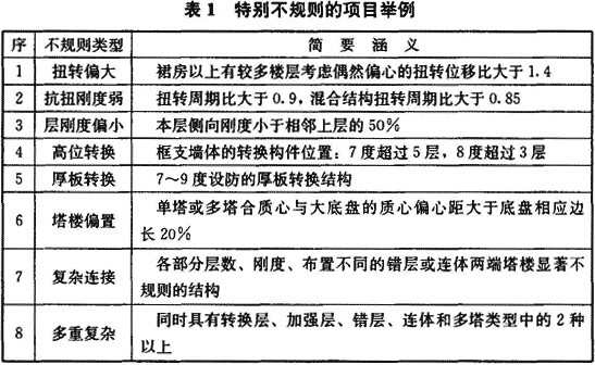 特别不规则,指具有较明显的抗震薄弱部位,可能引起不良后果者,其参考界限可参见《超限高层建筑工程抗震设防专项审查技术要点》,通常有三类:其一,同时具有本规范表3.4.3所列六个主要不规则类型的三个或三个以上;其二,具有表1所列的一项不规则;其三,具有本规范表3.4.3所列两个方面的基本不规则且其中有一项接近表1的不规则指标。