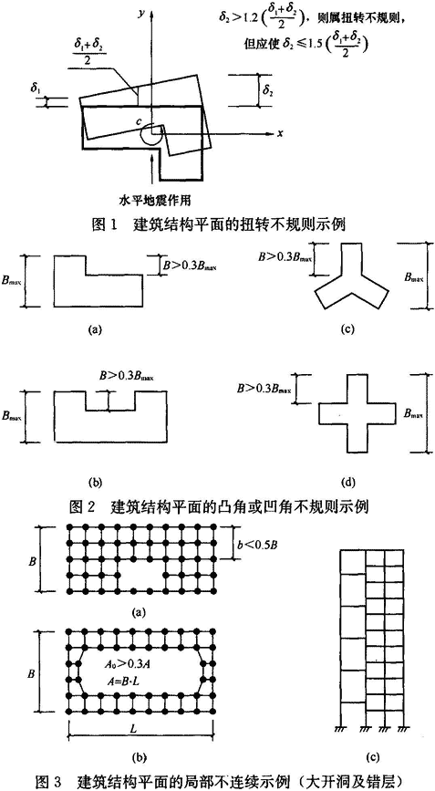 3.4.3、3.4.4 2001规范考虑了当时89规范和《钢筋混凝土高层建筑结构设计与施工规范》JGJ 3-91的相应规定,并参考了美国UBC(1997)日本BSL(1987年版)和欧洲规范8。上述五本规范对不规则结构的条文规定有以下三种方式:
