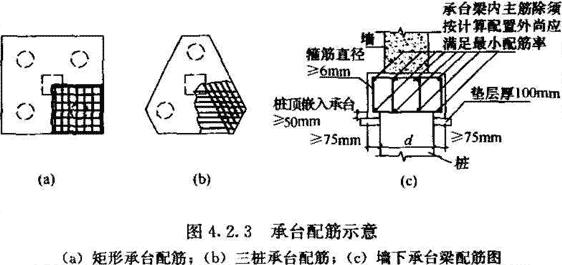 3 条形承台梁的纵向主筋应符合现行国家标准《混凝土结构设计规范》GB 50010关于最小配筋率的规定[见图4.2.3(c)],主筋直径不应小于12mm,架立筋直径不应小于10mm,箍筋直径不应小于6mm。承台梁端部纵向受力钢筋的锚固长度及构造应与柱下多桩承台的规定相同。