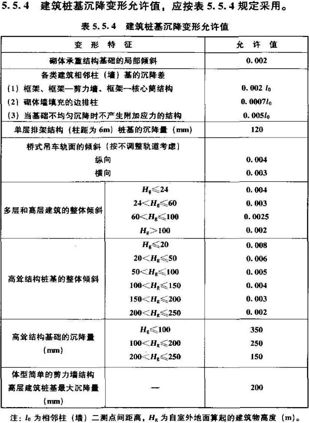 5.5.5 对于本规范表5.5.4中未包括的建筑桩基沉降变形允许值,应根据上部结构对桩基沉降变形的适应能力和使用要求确定。