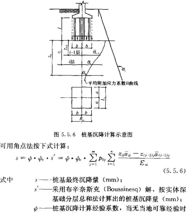 5.5.6 对于桩中心距不大于6倍桩径的桩基,其最终沉降量计算可采用等效作用分层总和法。等效作用面位于桩端平面,等效作用面积为桩承台投影面积,等效作用附加压力近似取承台底平均附加压力。等效作用面以下的应力分布采用各向同性均质直线变形体理论。计算模式如图5.5.6所示,桩基任一点最终沉降量