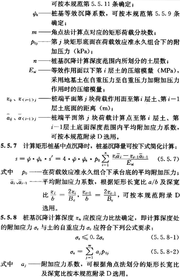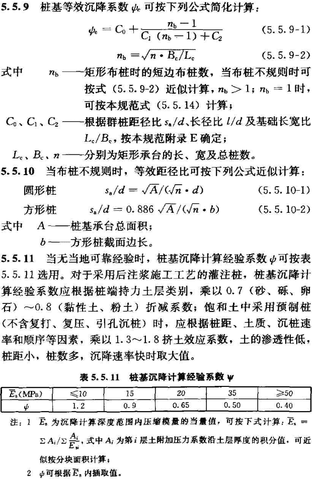 5.5.12 计算桩基沉降时,应考虑相邻基础的影响,采用叠加原理计算;桩基等效沉降系数可按独立基础计算。