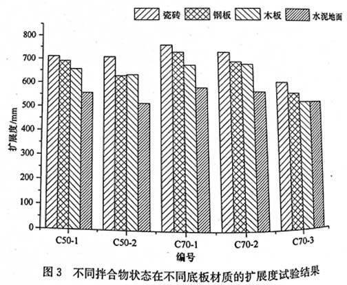 5.1.2 本条规定了试验所需设备及应满足的要求。明确了底板的尺寸、厚度、平整度和材质要求。图3分别对比了不同拌合物状态的混凝土试样在钢板、瓷砖地面、不吸水木板和普通水泥地面的扩展度试验结果。