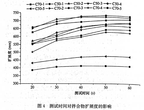 由图4的结果分析可知,在坍落度筒提起后,大流动性混凝土拌合物的扩展度,随时间的增加而不断增加,在一分钟左右达到稳定;拌合物的流动速率随时间的增加而不断降低,其中拌合物在坍落度筒提起50s后的,流动速率大幅降低。现代大流动性混凝土胶凝材料用量大、水胶比低、高效减水剂与矿物掺合料用量大,使得其拌合物塑性黏度增大,在一定范围内,拌合物的塑性黏度越大,其流动时间越长,测试时间对测试结果的影响就越大。对于大流动性混凝土来说存在扩展度扩展缓慢的情况,而原标准只是规定了测定最终的扩展度值,扩展度的判断主观影响因素较大。本标准修订规定不再扩散时间达到50s时测试扩展度试验结果能够代表最终的扩展度值,不仅提高试验效率,而且增加了试验的可操作性和客观性。