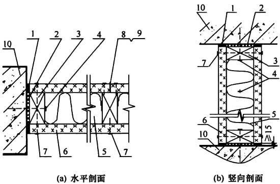 8-墙面板连接处密封材料(石膏粉密封膏或弹性密封膏);9-墙面板连接缝密封纸带;10-建筑物的混凝土柱、楼板