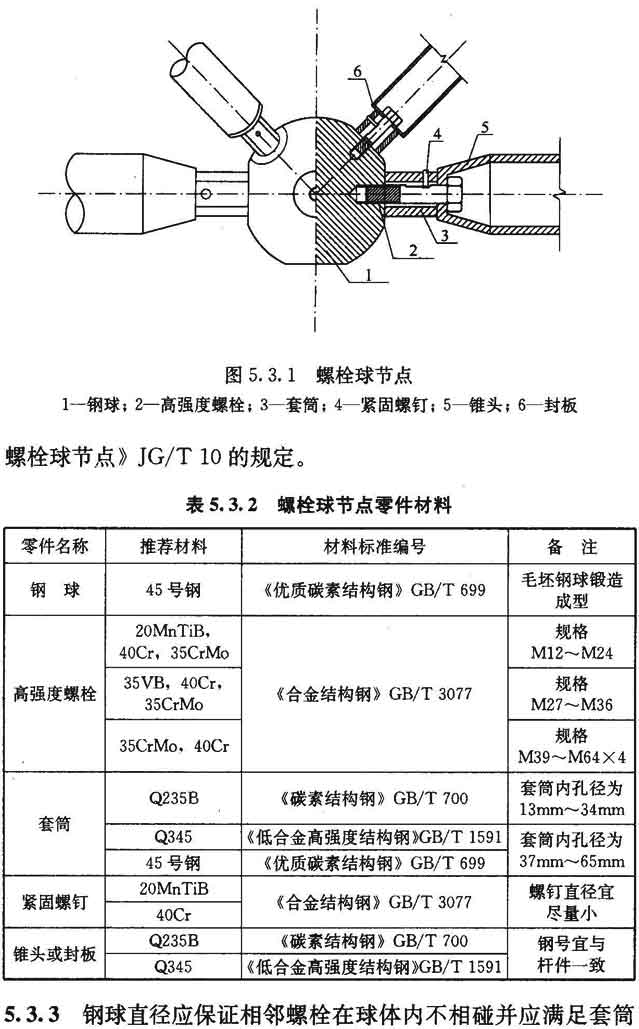5.3.2 用于制造螺栓球节点的钢球、高强度螺栓、套筒、紧固螺钉、封板、锥头的材料可按表5.3.2的规定选用,并应符合相应标准技术条件的要求。产品质量应符合现行行业标准《钢网架