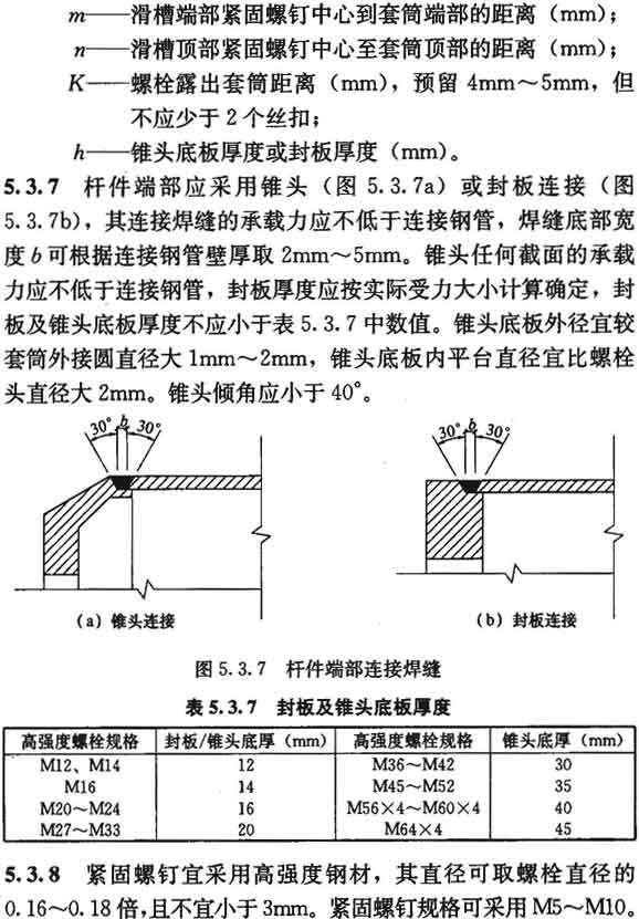 5.3.6 套筒(即六角形无纹螺母)外形尺寸应符合扳手开口系列,端部要求平整,内孔径可比螺栓直径大1mm。